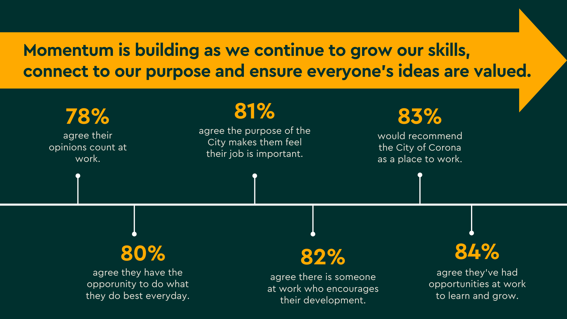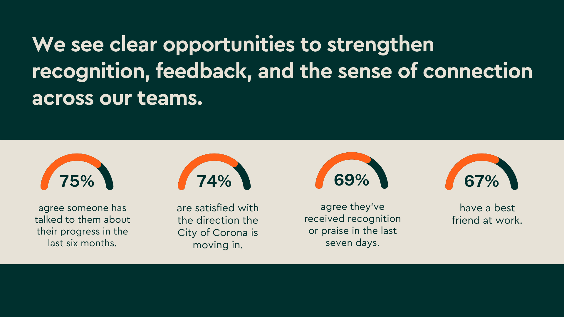 Where can we grow? You want to feel more recognized, more connected, and more in sync with the direction of the City. You are looking for moments that celebrate our contributions, clarity about progress, and relationships that make work feel meaningful. Focusing on these opportunities allows us to build a clearer, more connected path forward together.