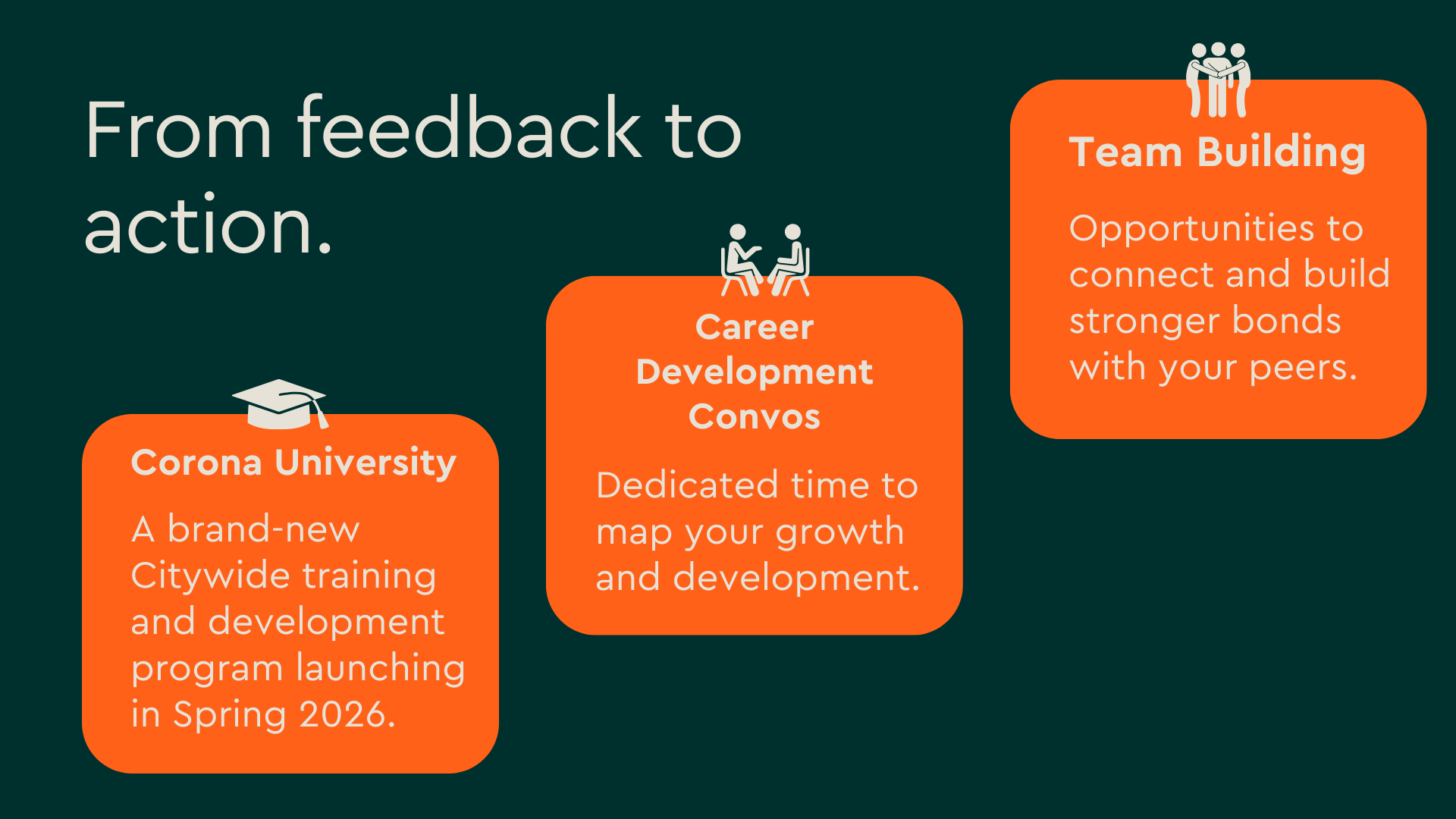 So what now? We heard your interest in learning and growth opportunities. Corona University is our new internal Citywide training and development program launching soon. It brings together workshops, courses, and learning opportunities for all employees, designed to build skills, strengthen leadership, and support your career growth. This directly responds to your call for more chances to learn and do your best work every day. Class is almost in session; Corona University will begin enrolling in Spring 2026!